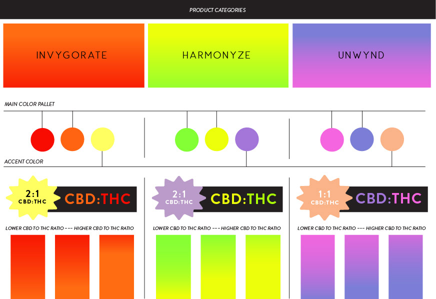 Conceptualized a key to visually help break down the different types of cannabis products by strain, ratio, and effects. The three main categories (Invygorate, Harmonyze, and Unwynd) are representing Sativa, Hybrid, and Indica products. Within these three categories, their gradient levels serve as a key for CBD to THC ratio. Abiding by this blueprint for the brand’s package design makes it easier for reoccurring customers to quickly choose the product they want just by seeing the packaging.